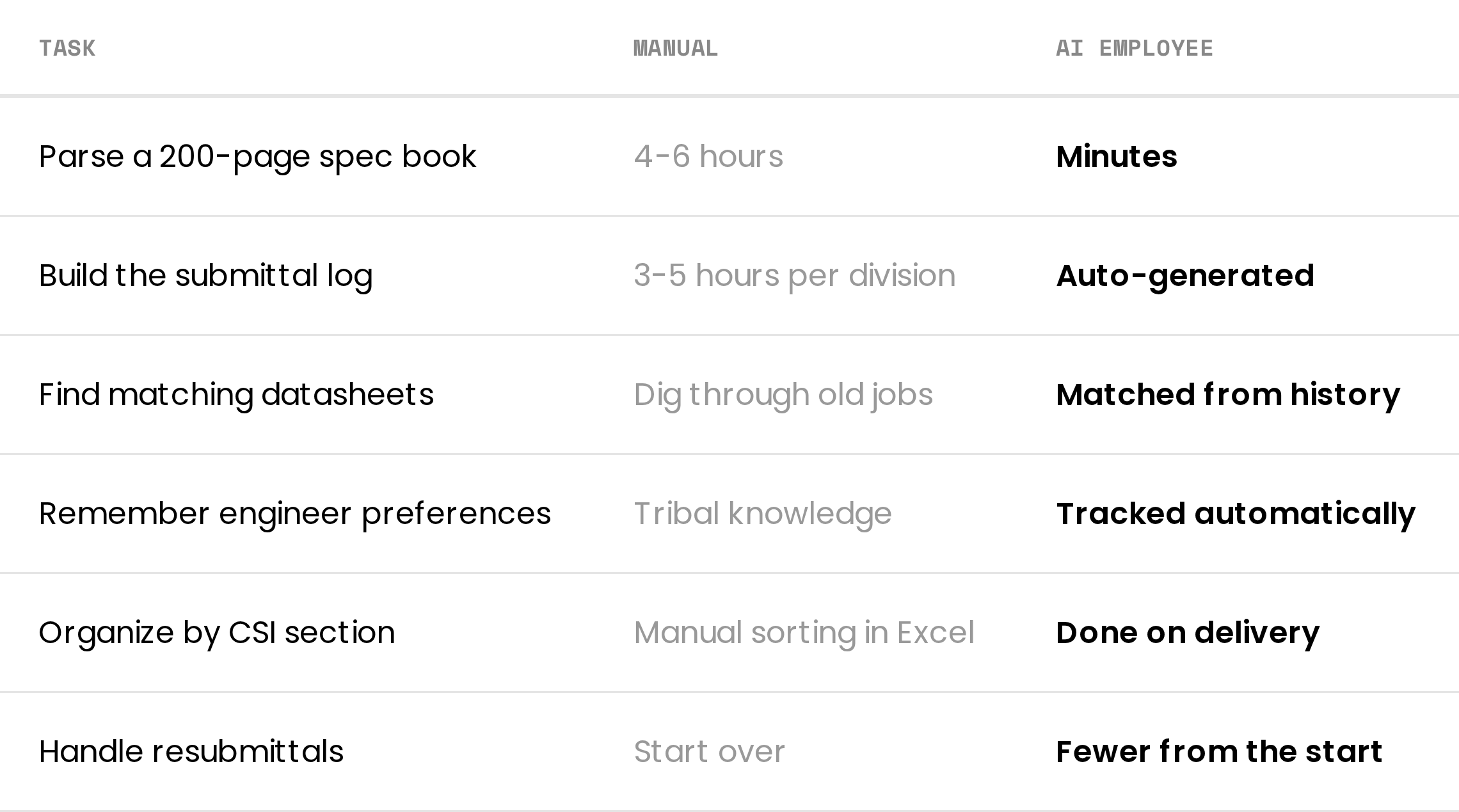 The AI Submittal Employee reads your specs, matches products from your past jobs, and delivers organized submittal packages — panels, switchgear, lighting, fire alarm, all of it. It learns what your engineers approve and gets better every job.